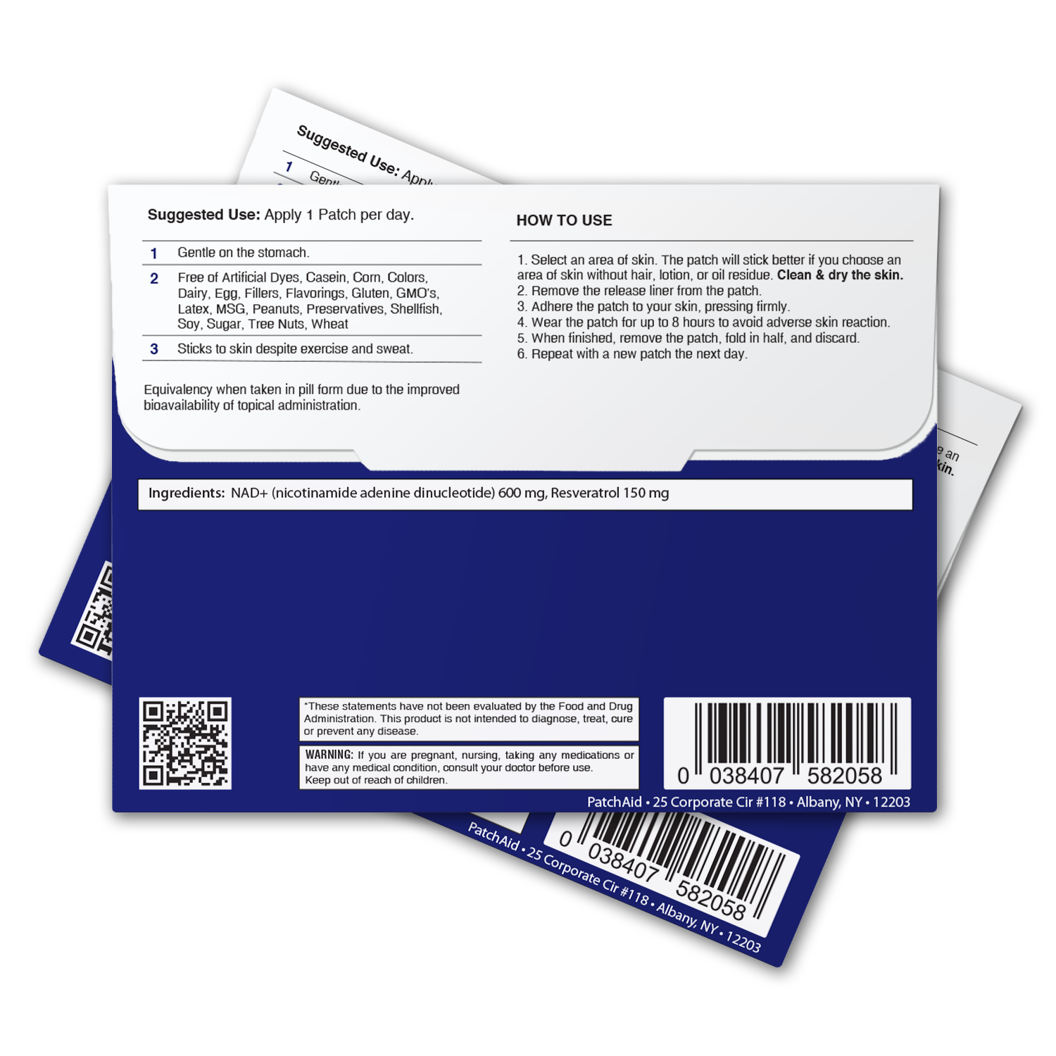 All NAD+ patches are free of Artificial Dyes, Casein, Corn, Colors, Dairy, Eggs, Fillers, Flavorings, Gluten, GMOs, Latex, MSG, Peanuts, Preservatives, Shellfish, Soy, Sugar, Tree Nuts, and Wheat.